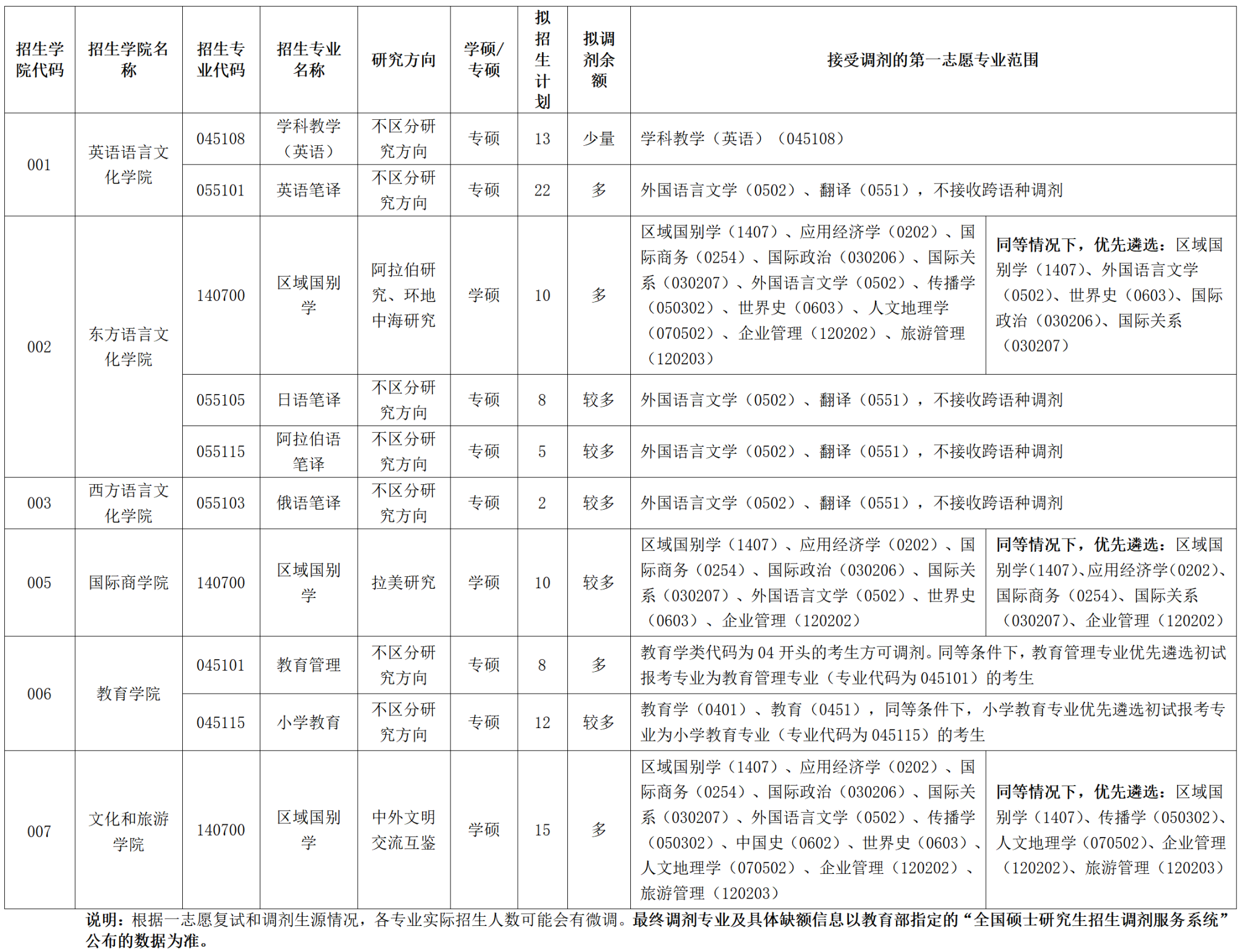 根据2026年学校招生计划和一志愿拟录取情况,我校区域国别学学术学位、教育、翻译专业学位硕士点有部分调剂名额。欢迎有意向调剂我校的考生密切关注我校研究生招生网和相关招生学院网站。现将相关信息公告如下: